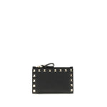 The leather Card holder by Valentino Garavani is crafted from grained calfskin and embellished with the iconic platinum-finish Rockstuds. It features a snap-button closure, a zipped coin compartment, six card slots and two flat pockets, offering a compact and luxurious blend of functionality and signature style.