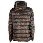 Add short nylon camouflage print down jacket with duck down filling, zipper and button closure, drawstring hood, two front and two chest pockets