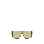 The Havana T-Bar sunglasses by Alexander McQueen feature a bold silhouette, with a warm-toned tortoiseshell acetate frame paired with brown gradient lenses. The oversized visor shape is enhanced by gold-tone metal temples, designed as elegant T-Bars and engraved with the McQueen logo.