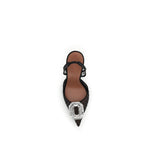 The Camelia Sling 105 Pumps in Polka-Dot Lace by Amina Muaddi embody refined femininity and contemporary allure. Crafted from black polka-dot satin, these pumps feature a pointed toe adorned with a rectangular mirrored embellishment for a touch of glamour. The slingback strap ensures a graceful fit, while the brand’s signature 105mm sculptural heel adds a modern, elevated finish — perfect for evening elegance.