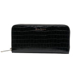 Baldinini leather wallet with croco print, metal logo on front, zipper closure.