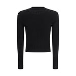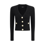 Cardigan by Balmain, cropped design, v-neck on front, closure by embossed buttons, close fit, monochrome pattern.