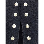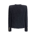 Balmain’s tweed Spencer Jacket is an iconic piece, featuring a round neckline and structured shoulders that define the silhouette. The long sleeves end with straight cuffs decorated with five gold metal "Coin" buttons, while twelve decorative "Gold and Gold Coin" buttons stand out on the front, adding a touch of luxury. The raw cut finish and serge lining complete the design, combining elegance and sophistication typical of the Maison.