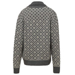 Cruciani Cashmere Cardigan. Grey color with contrasting white geometric workmanship. Front fastening with buttons. Composition: 100% Cashmere