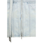 The De-Saphix-Fsi1 Jacket by Diesel, unveiled during the SS26 Runway Show, fuses biker codes with a sleek racer attitude in a slim, cropped silhouette. The round collar extends into a long wraparound strap fastened with a logo button and finished with a metal D detail, adding a distinctive signature touch. Crafted from innovative satin denim in a cotton and hemp blend, the fabric features a luminous surface enriched with ultra-fine metallic threads. Laser treatments create bold contrasts between matte and glossy areas, while a hand-sprayed coating and sulfur-based pigments generate sophisticated grey tones with a unique worn effect. A convex D-logo button encased in transparent resin adds a jewel-like accent, complemented by an embossed leather back label. Complete with a D-logo zip closure, welt chest pocket, and lyocell lining, this jacket embodies Diesel’s experimental craftsmanship and contemporary edge.