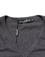 Dolce & Gabbana Grey Cotton V-Neck Logo Plaque Melange T-Shirt