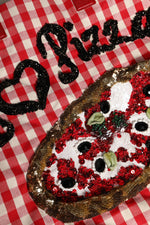 Gorgeous brand new, 100% Authentic Dolce & Gabbana red checkered embellished shopping tote cotton bag I LOVE PIZZA rhinestone-embellished tote bag.