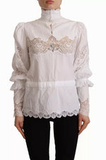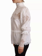 Dolce & Gabbana White Cotton Lace Trim Turtle Neck Blouse Top