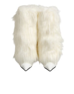 Dolce & Gabbana White Fur Pointed Knee High Stiletto Boots Shoes