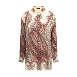 The Etro Shirt is made of pure silk crêpe de Chine and stands out for its long and straight design, embellished with a placed floral Paisley print, emblem of the iconic style of the maison. The regular fit ensures comfort and elegance, completed by a classic collar, long sleeves and buttoned cuffs for a touch of sophisticated femininity.