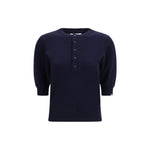 The n°477 Mimi crew-neck Sweater, crafted from soft cashmere. Featuring elbow-length sleeves and ribbed details at the neckline, hem, and cuffs, it stands out for its row of corozo buttons – a natural material derived from palm tree seeds – running from the neck to the navel. Designed in a petite fit, the Mimi combines the softness of cashmere with effortless elegance.