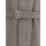 The Coat by Ferragamo is crafted from a refined herringbone-patterned fabric, showcasing timeless sophistication. It features a button-front closure and two front welt pockets. The structured collar includes an additional internal fastening with a concealed strap and buttons, offering both a tailored look and extra protection from the wind. Finished with a matching belt to define the waist, this piece reflects Ferragamo’s signature balance of craftsmanship, elegance, and contemporary design.