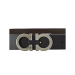 Calfskin Reversible Belt by Ferragamo, double-face design, metal buckle with iconic Gancini logo. Thickness: 3.5 cm.