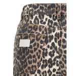 Cotton Pants by Ganni featuring five-pocket flare style, all-over animal print design, contrasting zipper and logo button closure, belt loops, tone-on-tone embossed monogram patch applied to back pocket.