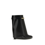 The leather Shark Ankle Boots by Givenchy are a bold mix of elegance and grit. With a distinctive Shark silhouette, they feature a metal clip engraved with “GIVENCHY” and gold-finish metal details that enhance the design. The pointed toe and covered wedge heel add a sophisticated touch, while the wraparound upper provides optimal support for the foot, ensuring comfort and stability. Perfect for those looking for a bold, contemporary style.