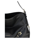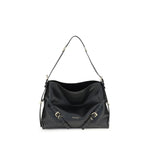 Givenchy’s Voyou Shoulder Bag medium features a soft V-shaped silhouette and generous volume. The adjustable shoulder strap allows it to be carried by hand, shoulder or crossbody, ensuring maximum versatility. The GIVENCHY signature is stamped on both the front and top of the bag, while engraved metal clasps and gold-tone finish details complete the design with elegance.