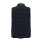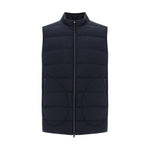 Vest by Herno, high collar, front panel zipper closure, two front zippered welt pockets, quilted design, monochrome pattern, adjustable waistband via concealed drawstring, regular fit.