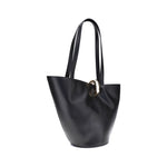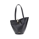 The large La Bambola Bucket Bag is a sophisticated accessory with a contemporary and refined design. Crafted from smooth leather, it stands out for its asymmetrical silhouette and refined details, such as the front closure with a gold metal ring and the logo applied on the bottom. Equipped with two on-top handles and an adjustable and removable shoulder strap, it offers versatile portability. The interior, with a single compartment, is completed by a practical zip pocket, perfect for neatly storing essentials.