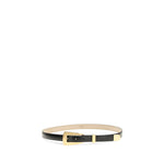 The Lucca leather Belt by Khaite is an elegant accessory in soft calfskin leather, defined by an elongated trapezoidal buckle and compact dimensions that enhance its versatility. Polished metal hardware, made in Italy from 18-karat gold-plated brass, adds a precious and refined touch.