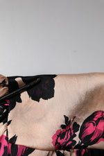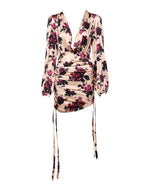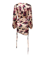 Laneus Pink Floral Silk Long Sleeves V-neck Ruched Mini Dress