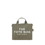 Cotton The Medium Tote Handbag by Marc Jacobs, two rigid tubular top handles, top zipper closure, single interior pocket, adjustable and removable flat shoulder strap, contrasting iconic brand monogram print on front, contrasting iconic brand monogram patch applied on back.