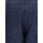 The Margiela Cotton Trousers blend elegance with signature details. The fabric features tonal stripe embroidery across the entire surface and the iconic contrasting stitch on the back for a distinctive touch. Belt loops accommodate a belt, while a zip, hidden hook, and single visible button ensure practical closure. Five classic front pockets and two back patch pockets complete the design, with a raw-cut hem adding a modern finish