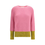 Marni’s wool Sweater features a color-block design made from a wool and viscose blend yarn, knitted in English rib. With a regular fit, long sleeves and a crew neckline, it is embellished with a hand-embroidered Marni logo and topstitching details on the bust and sleeves, adding a refined, handcrafted touch.