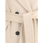 The double-breasted Coat by Max Mara Studio is a refined, feminine piece crafted from a luxurious zibeline drap blend of pure cashmere, alpaca, and wool. The straight-cut midi silhouette is enhanced by a matching belt that defines the waist, creating an elegant and balanced look. Featuring a classic notched lapel, long kimono sleeves, and front flap pockets, the fully lined design combines timeless tailoring with cozy sophistication — a perfect outerwear staple for the colder months.