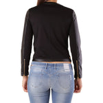 Womens black blazer Lapel collar Long sleeves Zip fastening Perfect for fall/winter season Made from 5% elastane 25% polyamide and 70% viscose Faux leather Polyester Size on Tag: XS