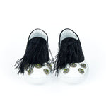 Step into a world where Italian craftsmanship meets chic elegance with these stunning slip-ons from Mr&Mrs Italy. Adorned with a dazzling jewel appliqué on the tip, these shoes make a bold statement while the playful feather insert on the contrasting tongue adds an unexpected twist of whimsy. Crafted from the finest bovine leather, these round-toe beauties are grounded with a durable rubber sole, ensuring both comfort and style. Perfect for those who dare to stand out.