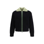 The Evan Zipped Cardigan by Namacheko is crafted in a thick rib stitch and features two-way zippers with a nickel finish and visible contrasting zip tape. Its boxy silhouette is enhanced by double-folded ribs at the neckline and hem, creating a modern and structured look.
