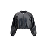 The Pinko cropped bomber is crafted from coated fabric with a leather-effect finish, lightly padded for comfort and warmth. It features a front zip closure, ribbed-knit bomber collar, long raglan sleeves, and ribbed cuffs. Side...