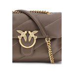 Calfskin Love Classic Shoulder Bag by Pinko, front closure with magnetic button, iconic gold-plated Love Birds logo embossed on the front, quilted and padded design, double internal compartment, sliding chain shoulder strap, iconic brand monogram embroidered tone-on-tone on the back.