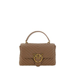 Calfskin Love Lady Handbag by Pinko, front magnetic button closure, iconic gold-plated and embossed Love Birds logo on front, quilted and padded design, double interior compartment, sliding chain shoulder strap, flat rigid handle at top, interior flat pocket with zipper, iconic tone-on-tone embroidered brand monogram on back.