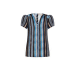 The Rinascimento BACI SELFIE-W CFC0115111 women’s blouse is a refined and versatile garment, perfect for completing any outfit with style. Made from 100% polyester, this short-sleeved blouse features a lightweight and comfortable fabric that provides a smooth and pleasant fit. The geometric zigzag pattern adds a modern and dynamic touch, while the V-neckline with a small button closure at the back offers a chic and feminine detail. The slightly puffed short sleeves enhance the silhouette, making this blouse suitable for both casual and more formal looks. Ideal for spring and summer, this Rinascimento blouse is the perfect choice for those seeking a sophisticated and contemporary style.