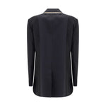 The Wool Blazer by Sacai is a sophisticated piece that blends classic elegance and stylistic experimentation. Made of fine wool, it features a double-breasted cut with front buttons that emphasize its tailored structure. On the front, two welt pockets with flaps add functionality and symmetry to the design. Particularly distinctive is the double layer of peaked lapels, an iconic element that gives the blazer a strong visual identity and contemporary appeal. A perfect garment for those seeking sophistication with an innovative twist.