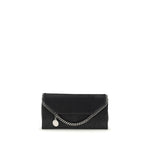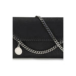 The Falabella Continental Clutch Bag by Stella McCartney is a refined wallet-style shoulder bag made of black vegan Shaggy Deer fabric, a symbol of the brand’s commitment to sustainable fashion. Embellished with the iconic chain pendant, it features a snap-button closure that houses an organized interior with a flat bill pocket, eight card slots and a zippered pocket for coins or small items.