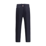 Thom Browne’s Melbourne cotton Pants are a stylish design with a straight-leg cut that gives a refined silhouette. The front closure consists of a hook, button and zipper for a secure and stylish fit. Two side welt pockets and two buttoned back welt pockets offer practicality and a touch of class. The iconic tricolor patch applied to the back adds a distinctive brand detail. With a high waist, these pants combine classic elegance and modernity, perfect for a sophisticated and timeless look.