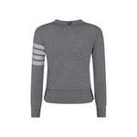 Cotton Sweatshirt by Thom Browne, ribbed crew neck, iconic contrast brand logo bands at arm, ribbed cuffs, side buttons for slit, contrast embroidered brand logo tag at front. Season: SS26 Composition: 100% Cotton
