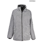 long-sleeved jacket, reversible, black/black and white check, 2 outside pockets, 2 inside pockets, buttons, zip, embroidery, waterproof, logo
