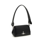 The Hazel small Shoulder Bag by Vivienne Westwood is an elegant and versatile accessory. Made from faux leather, it is embellished with a metallic Orb detail on the front. Featuring a removable flat handle and a removable metal chain shoulder strap, it can be carried on the shoulder or by hand. The magnetic button closure under the flap, the inner lining, and the protective metal feet at the base complete the design, combining practicality and iconic style.