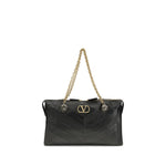 The Growl Medium leather Bag by Valentino Garavani embodies the brand’s signature sophistication and artisanal mastery. Crafted in Italy from black quilted leather, it stands out for its golden-tone details and the iconic VLogo on the front. The removable studded shoulder strap allows for both hand and shoulder carry, adding versatility and bold personality. Finished with structured handles and a double zip-top closure, it’s an accessory that blends femininity, edge, and refined urban elegance.