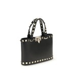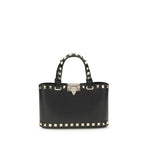 The Mini Shopping Rockstud by Valentino Garavani is crafted from grained calfskin and can be worn on the shoulder, cross-body, or carried by hand thanks to its handles and removable chain. It is adorned with studs and metal parts in a platinum finish and features a hook closure. The nappa lining and interior with two card slots complete this versatile and refined bag.