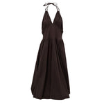In brown cotton, crossover top, waistband, very wide skirt part, side slit. On the back, open back, zip closure.