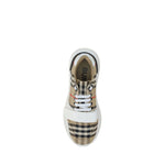 The New Regis Sneakers by Burberry feature a modern silhouette with a slightly elongated toe and lace-up front closure, enhanced by a convenient Velcro strap detail on the front. The iconic Check Archivio pattern wraps the all-over upper, while the brand’s contrasting signature on the back adds a distinctive and instantly recognizable touch.