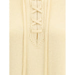 The pure cashmere Sweater by Ermanno Scervino embodies the perfect balance between craftsmanship and contemporary vision. A highlight of the Fall/Winter 2025–26 runway, it stands out for its wide ribbed neckline that frames the décolleté and the deep V-neck laced closure, a refined detail that blends sporty allure with timeless elegance. Along the sides, hand-woven cashmere ribbons create delicate braids that celebrate the Maison’s artisanal mastery, while ribbed finishes at the hem, cuffs, and collar define the silhouette with softness and structure. Entirely crafted from cashmere, this piece expresses natural sophistication and the art of knitwear at its highest form.