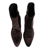 mid-calf boots, crafted from soft brown cotton velvet for a plush, sophisticated look. The sleek silhouette and rich texture make them a versatile choice for both casual and dressier ensembles. Perfect for adding a touch of refinement to your cold-weather wardrobe.