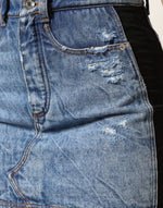 midi skirt features a blue-black cotton denim base with sheer panel detailing. The design blends casual denim texture with a hint of allure, creating a modern and fashion-forward statement piece.