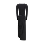 The Long-Sleeve Suspended Dress by Coperni features a fluid line that wraps the body with precision, defined by a high side slit that enhances the silhouette. A sculptural drape at the hip and a low-waisted belt interrupt the softness of the fabric, creating a harmonious contrast between structure and sensuality. The design embodies the brand’s architectural and contemporary vision, where purity of form meets an essential, modern sense of motion.