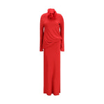 The long open-back Dress with high neck embodies understated sophistication, crafted from soft viscose-silk jersey with a hint of stretch. Long raglan sleeves and a draped blouson-style top contrast elegantly with the fluid, body-skimming skirt. The front is defined by a modest high collar, while the back reveals an open design that creates a striking, unexpected effect. The collar fastens at the back with five buttons, and a detachable floral brooch adds a refined, feminine accent that can be styled as desired.